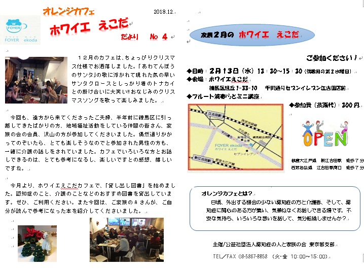 2019年2月2日 / 最終更新日時 : 2019年2月14日 東京都支部 各地のつどい オレンジカフェ ホワイエ えこだ こんな記事も読まれています。 11月・12月 会員のつどい お知らせ 1月・2月 会員のつどい お知らせ 11月12日「オレンジカフェ・ホワイエえこだ」開催報告 1月・2月 会員のつどい お知らせ 9月・10月 会員のつどい お知らせ あなたも「家族の会」の仲間になりませんか?無料で資料をお送りします。