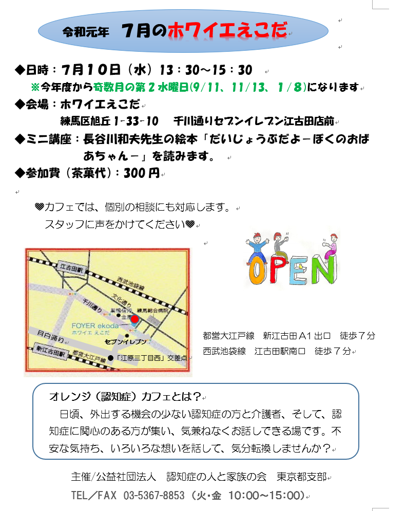 2019年6月9日 / 最終更新日時 : 2019年6月14日 東京都支部 会報ぽ~れぽ~れ オレンジカフェ ホワイエえこだ こんな記事も読まれています。9月10日認知症カフェ「ホワイエえこだ」開催案内11月認知症カフェ「ホワイエえこだ」開催11月12日「オレンジカフェ・ホワイエえこだ」開催報告認知症カフェ「ホワイエえこだ」プラス「オレン…9月・10月 会員のつどい お知らせ 9月開催された「ホワイエえこだ」報告7月9日水曜日認知症カフェ「ホワイエえこだ」開催「ホワイエえこだ」の報告 あなたも「家族の会」の仲間になりませんか?無料で資料をお送りします。