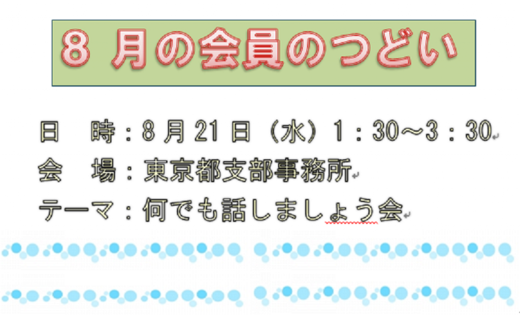 2019年7月6日 / 最終更新日時 : 2019年7月25日 東京都支部 会報ぽ~れぽ~れ 8月の会員のつどい こんな記事も読まれています。8月の会員のつどい あなたも「家族の会」の仲間になりませんか?無料で資料をお送りします。
