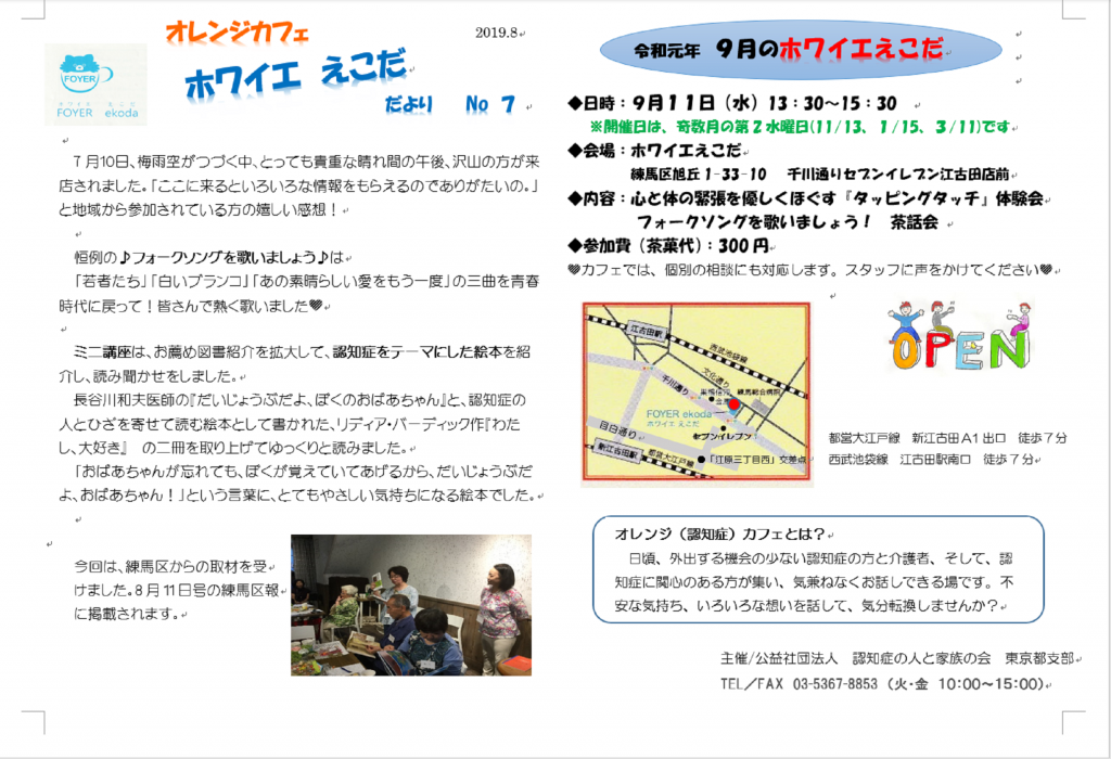 2019年8月8日 / 最終更新日時 : 2019年8月20日 東京都支部 イベント オレンジカフェ ホワイエえこだ こんな記事も読まれています。「ホワイエえこだ」の報告5月14日「オレンジカフェ・ホワイエえこだ」実施報告9月・10月 会員のつどい お知らせ 11月12日「オレンジカフェ・ホワイエえこだ」開催報告7月・8月 会員のつどい お知らせ 7月9日水曜日認知症カフェ「ホワイエえこだ」開催9月開催された「ホワイエえこだ」報告11月認知症カフェ「ホワイエえこだ」開催 あなたも「家族の会」の仲間になりませんか?無料で資料をお送りします。