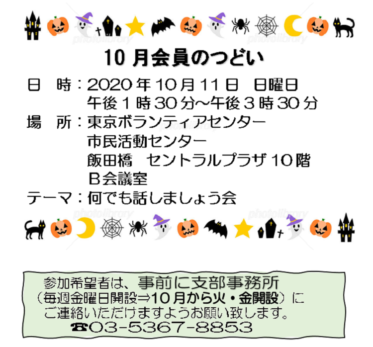 2020年9月27日 / 最終更新日時 : 2020年9月27日 東京都支部 各地のつどい 10月会員のつどい こんな記事も読まれています。10月会員のつどい あなたも「家族の会」の仲間になりませんか?無料で資料をお送りします。