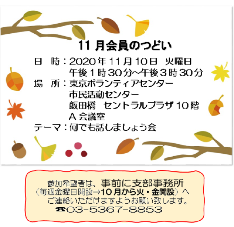 2020年10月18日 / 最終更新日時 : 2020年11月2日 東京都支部 各地のつどい 11月会員のつどい こんな記事も読まれています。11月会員のつどい あなたも「家族の会」の仲間になりませんか?無料で資料をお送りします。