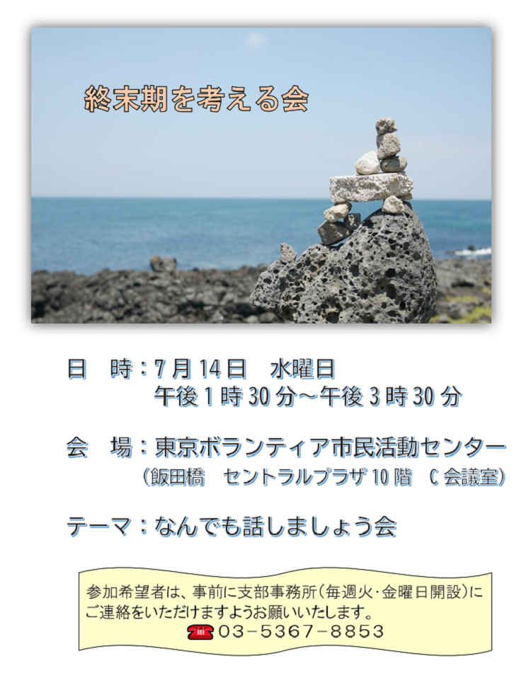2021年7月1日 / 最終更新日時 : 2021年7月5日 東京都支部 各地のつどい 終末期を考える会 こんな記事も読まれています。7月・8月 会員のつどい お知らせ 各地のつどい(2025年7月) あなたも「家族の会」の仲間になりませんか?無料で資料をお送りします。