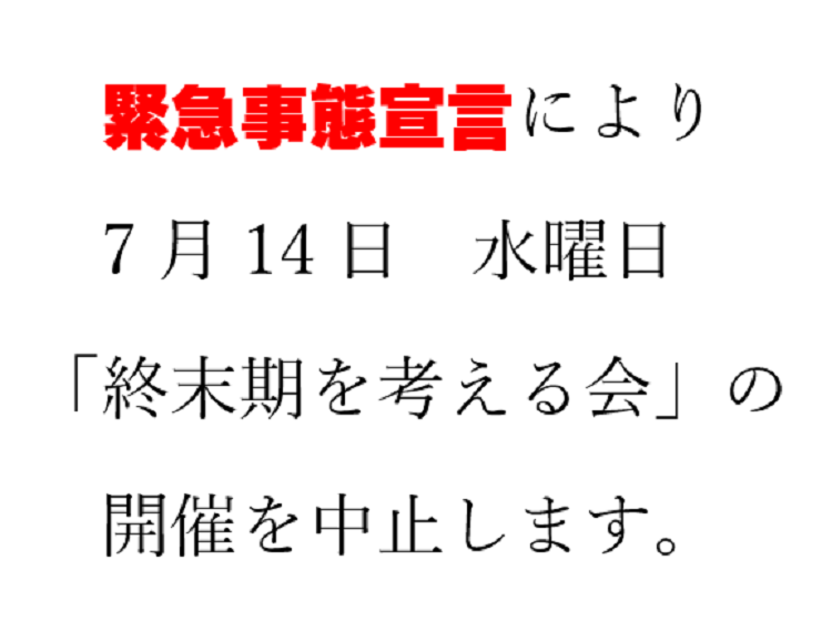 2021年7月13日 / 最終更新日時 : 2021年7月13日 東京都支部 全国のつどい 7月14日 「終末期を考える会」 開催中止 こんな記事も読まれています。各地のつどい(2025年7月)7月・8月 会員のつどい お知らせ あなたも「家族の会」の仲間になりませんか?無料で資料をお送りします。