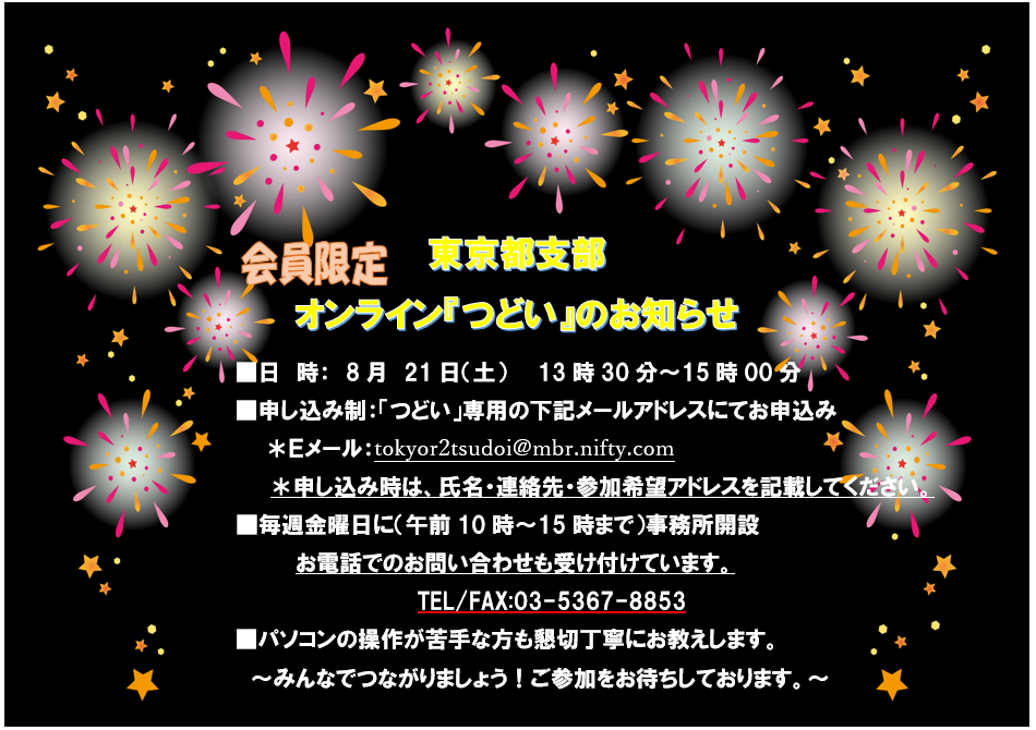 2021年8月2日 / 最終更新日時 : 2021年8月2日 東京都支部 各地のつどい 8月21日土曜日 オンライン会員のつどい開催 あなたも「家族の会」の仲間になりませんか?無料で資料をお送りします。