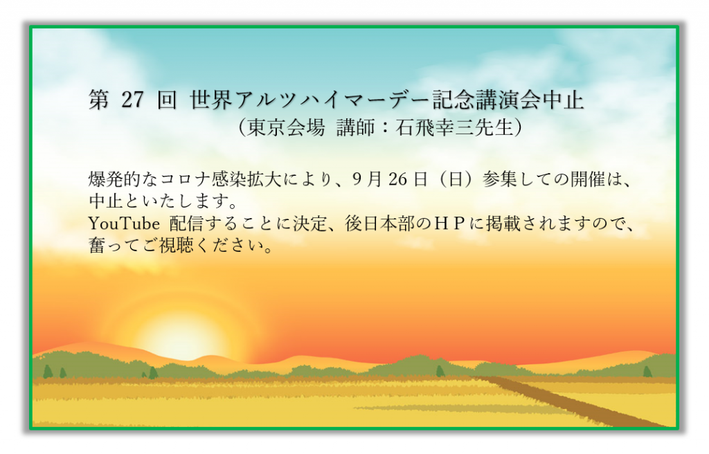 2021年9月16日 / 最終更新日時 : 2021年9月16日 東京都支部 世界アルツハイマーデー 9月26日世界アルツハイマー記念講演会の中止 後日、YouTube配信 あなたも「家族の会」の仲間になりませんか?無料で資料をお送りします。