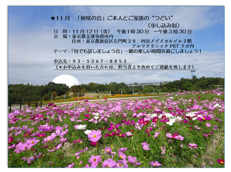 2021年10月30日 / 最終更新日時 : 2021年10月30日 東京都支部 全国のつどい 11月 「秋桜の会」ご本人とご家族の“つどい”(申し込み制) こんな記事も読まれています。1月・2月 会員のつどい お知らせ 9月・10月 会員のつどい お知らせ 11月・12月 会員のつどい お知らせ 1月・2月 会員のつどい お知らせ あなたも「家族の会」の仲間になりませんか?無料で資料をお送りします。