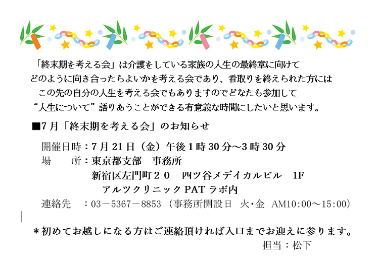 2023年6月23日 / 最終更新日時 : 2023年6月23日 東京都支部 全国のつどい 終末期を考える会 こんな記事も読まれています。7月・8月 会員のつどい お知らせ 各地のつどい(2025年7月) あなたも「家族の会」の仲間になりませんか?無料で資料をお送りします。