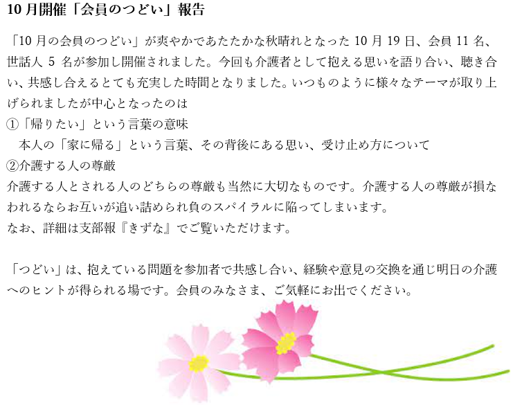 2023年10月24日 / 最終更新日時 : 2023年10月24日 東京都支部 全国のつどい 10月の「会員のつどい」報告 こんな記事も読まれています。7月・8月 会員のつどい お知らせ 各地のつどい(2025年7月)11月・12月 会員のつどい お知らせ 9月・10月 会員のつどい お知らせ あなたも「家族の会」の仲間になりませんか?無料で資料をお送りします。
