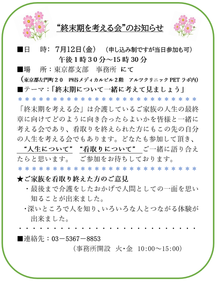 2024年6月18日 / 最終更新日時 : 2024年6月18日 東京都支部 東京都支部 7月12日 終末期を考える会開催 こんな記事も読まれています。本人(若年)のつどい(2025年7月)各地のつどい(2025年7月) あなたも「家族の会」の仲間になりませんか?無料で資料をお送りします。