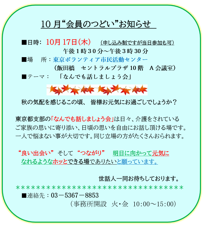 2024年10月2日 / 最終更新日時 : 2024年10月2日 東京都支部 全国のつどい 10月会員のつどい こんな記事も読まれています。10月会員のつどい あなたも「家族の会」の仲間になりませんか?無料で資料をお送りします。