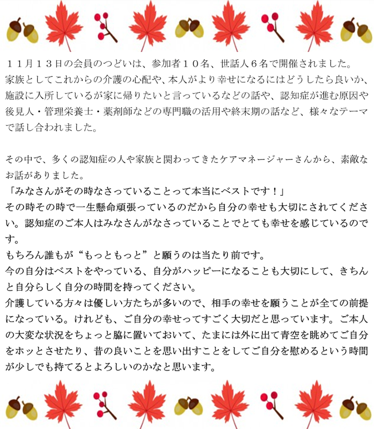 2024年11月23日 / 最終更新日時 : 2024年11月23日 東京都支部 全国のつどい 11月の会員のつどい報告 こんな記事も読まれています。11月の会員のつどい報告 あなたも「家族の会」の仲間になりませんか?無料で資料をお送りします。