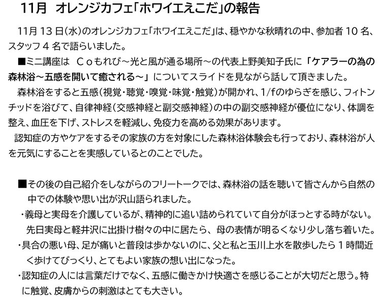 2024年11月23日 / 最終更新日時 : 2024年11月23日 東京都支部 全国のつどい 11月オレンジカフェ「ホワイエえこだ」の報告 こんな記事も読まれています。9月開催された「ホワイエえこだ」報告1月・2月 会員のつどい お知らせ 11月・12月 会員のつどい お知らせ 11月12日「オレンジカフェ・ホワイエえこだ」開催報告11月認知症カフェ「ホワイエえこだ」開催1月・2月 会員のつどい お知らせ 1月認知症カフェ「ホワイエえこだ」9月10日認知症カフェ「ホワイエえこだ」開催案内 あなたも「家族の会」の仲間になりませんか?無料で資料をお送りします。