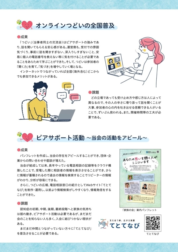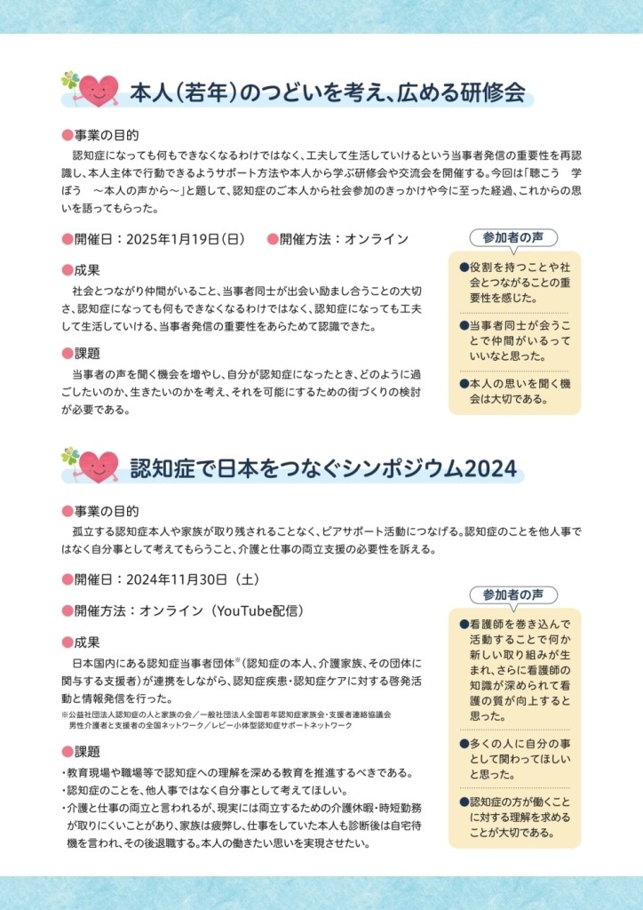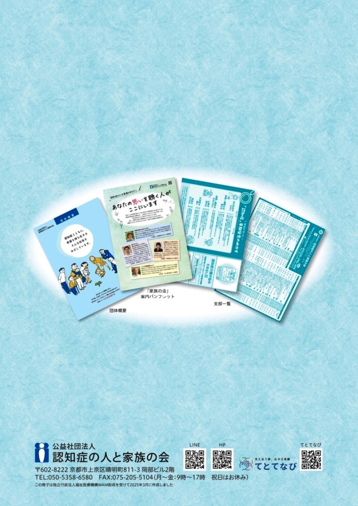 2025年3月31日 / 最終更新日時 : 2025年5月13日 「家族の会」本部事務局 活動 福祉医療機構(WAM)助成報告書 2024年度独立行政法人福祉医療機構の助成を受けて、ピアサポート活動事業を行いました。このたび事業報告書が完成しましたのでご覧ください。(2025年3月31日) ダウンロード(PDF) WAMreport2024(Web)ダウンロード こんな記事も読まれています。東濃地区11月カフェ/つどいの開催のお知らせ東濃地区9月カフェ/つどいの開催のお知らせ東濃地区5月カフェ/つどいの開催のお知らせ東濃地区8月カフェ/つどいの開催のお知らせ若年性認知症の人と家族のつどい『あんきの会』 9月のお知らせ若年性認知症の人と家族のつどい『あんきの会』…若年性認知症の人と家族のつどい『あんきの会』…東濃地区7月カフェ/つどいの開催のお知らせ あなたも「家族の会」の仲間になりませんか?無料で資料をお送りします。