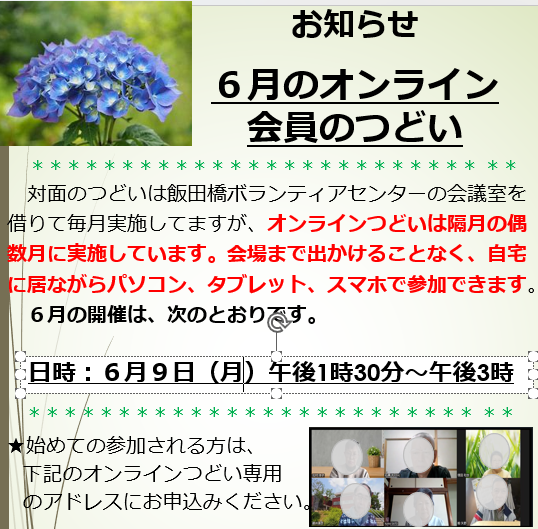 2025年5月29日 / 最終更新日時 : 2025年5月30日 東京都支部 イベント 6月オンライン会員のつどい tokyor2tsudoi@mbr.nifty.com こんな記事も読まれています。7月・8月 会員のつどい お知らせ 10月”オンラインつどい”のお知らせ9月・10月 会員のつどい お知らせ 11月・12月 会員のつどい お知らせ 8月”オンラインつどい”ご案内 あなたも「家族の会」の仲間になりませんか?無料で資料をお送りします。