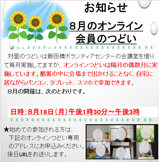 2025年8月1日 / 最終更新日時 : 2025年8月1日 東京都支部 イベント 8月”オンラインつどい”ご案内 始めて参加される方は、tokyor2tsudoi@mbr.nifty.comまでご連絡ください。 こんな記事も読まれています。6月オンライン会員のつどい11月・12月 会員のつどい お知らせ 10月”オンラインつどい”のお知らせ9月・10月 会員のつどい お知らせ 7月・8月 会員のつどい お知らせ あなたも「家族の会」の仲間になりませんか?無料で資料をお送りします。