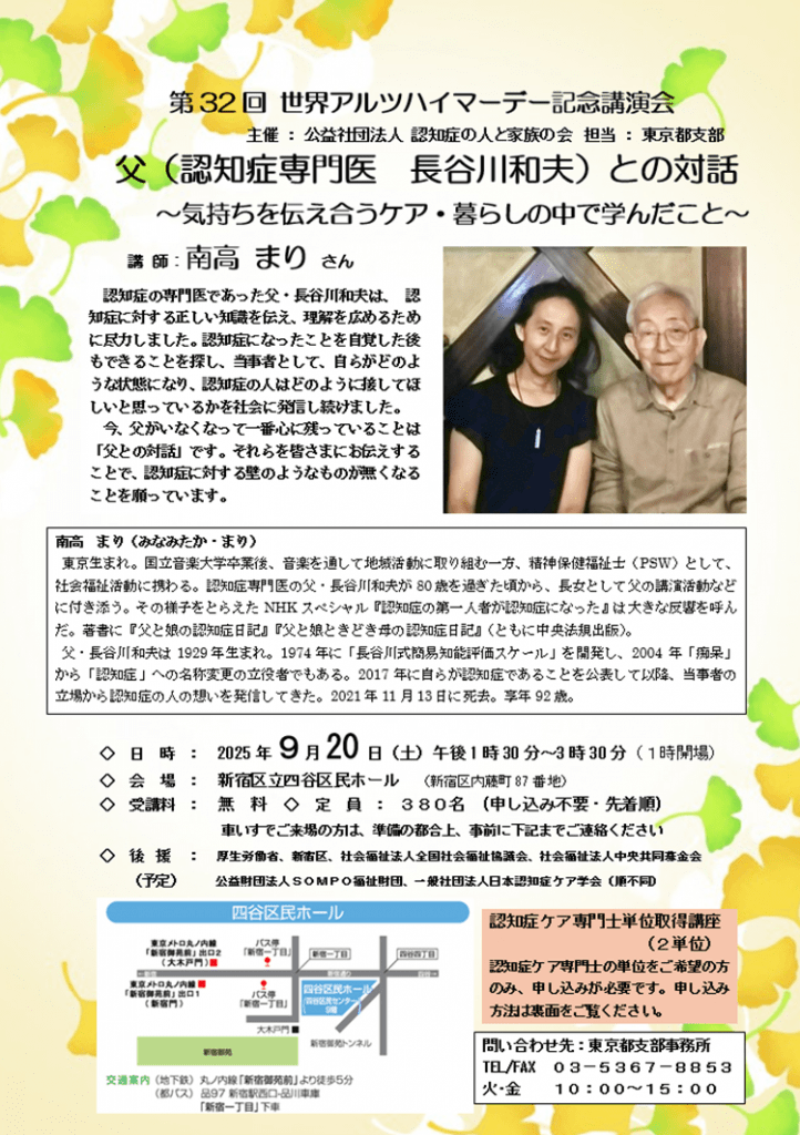2025年8月2日 / 最終更新日時 : 2025年8月2日 東京都支部 世界アルツハイマーデー 世界アルツハイマーデー記念講演会のご案内 あなたも「家族の会」の仲間になりませんか?無料で資料をお送りします。