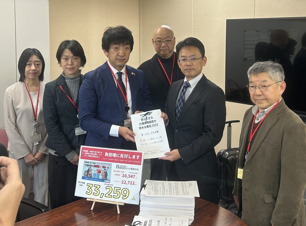 今回提出したのは、「安心できる介護保険制度を求める署名2025」の第一次集約分 33,259 筆です。この署名は、11 月10 日から12 月11 日までの間、全国の支部や会員の皆さん、そしてオンラインを通じて寄せられた、一人ひとりの大切な声です。