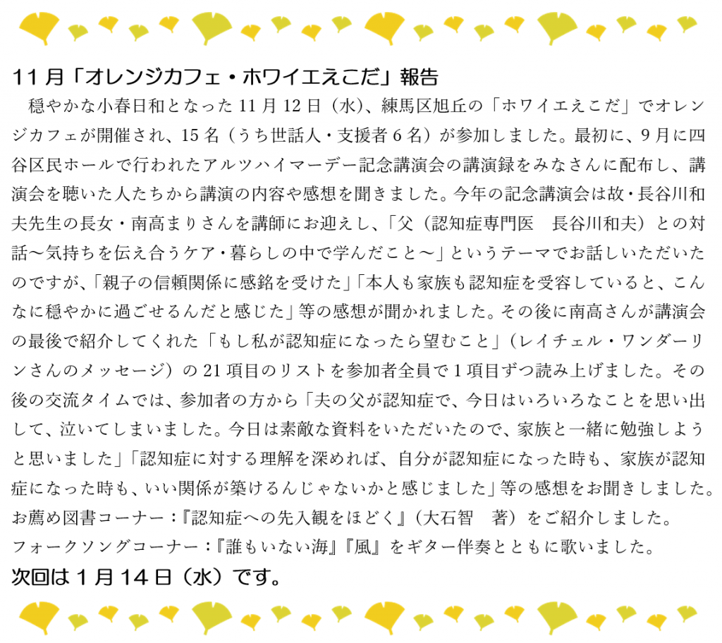 2025年11月15日 / 最終更新日時 : 2025年11月15日 東京都支部 全国のつどい 11月12日「オレンジカフェ・ホワイエえこだ」開催報告 こんな記事も読まれています。9月開催された「ホワイエえこだ」報告5月14日「オレンジカフェ・ホワイエえこだ」実施報告7月9日水曜日認知症カフェ「ホワイエえこだ」開催11月認知症カフェ「ホワイエえこだ」開催9月・10月 会員のつどい お知らせ 9月10日認知症カフェ「ホワイエえこだ」開催案内7月・8月 会員のつどい お知らせ 11月・12月 会員のつどい お知らせ あなたも「家族の会」の仲間になりませんか?無料で資料をお送りします。