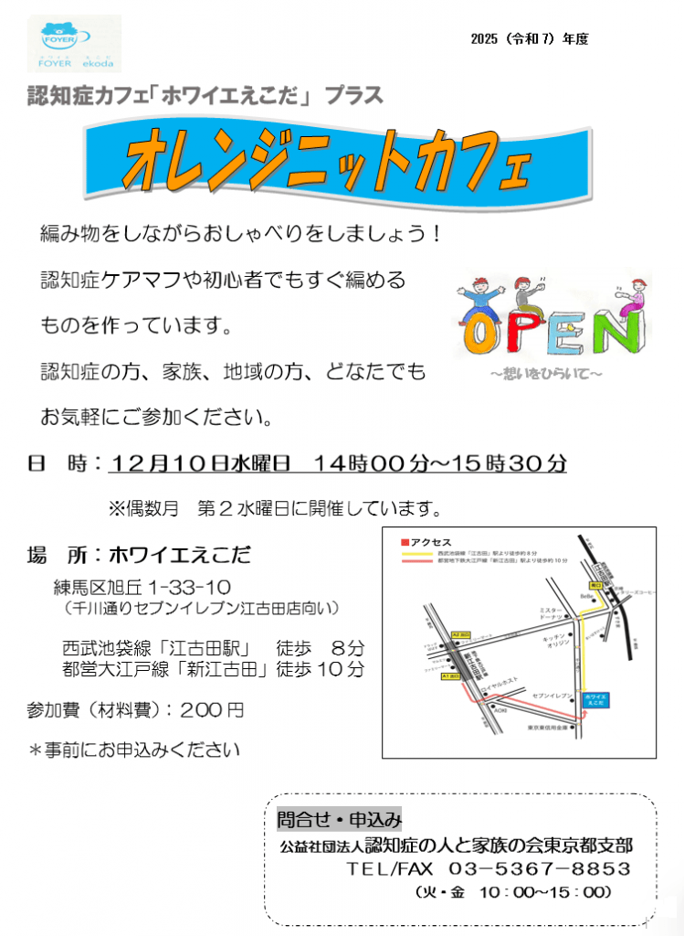 2025年12月5日 / 最終更新日時 : 2025年12月5日 東京都支部 全国のつどい 認知症カフェ「ホワイエえこだ」プラス「オレンジニットカフェ」開催 こんな記事も読まれています。11月12日「オレンジカフェ・ホワイエえこだ」開催報告茨城 6月活動予定東濃地区9月カフェ/つどいの開催のお知らせ7月・8月 会員のつどい お知らせ 茨城11月活動予定7月9日水曜日認知症カフェ「ホワイエえこだ」開催「ホワイエえこだ」の報告東濃地区8月カフェ/つどいの開催のお知らせ あなたも「家族の会」の仲間になりませんか?無料で資料をお送りします。