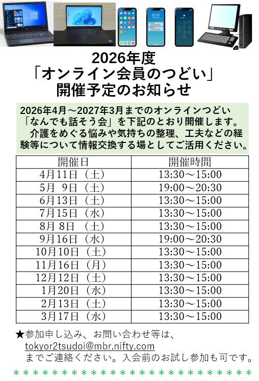2026年3月31日 / 最終更新日時 : 2026年3月31日 東京都支部 各地のつどい 2026年度オンライン会員のつどい年間開催予定 あなたも「家族の会」の仲間になりませんか?無料で資料をお送りします。